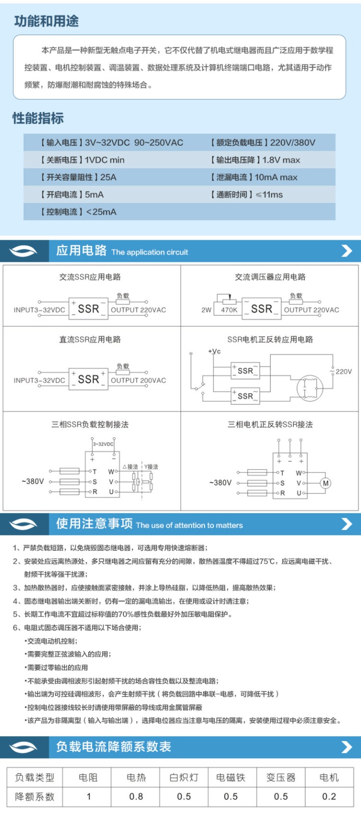 SSR-DD系列固态继电器采用阻燃工程塑料外壳,造型别致,结构新颖,自升螺丝压接式接线,使安装、检查方便、快捷、安全、可靠。输入端驱动电流小可非常方便的与计算机终端、各种数字程控电路进行接口,此系列产品广泛应用在石油化工仪器设备、食品机械、包装机械、纺织机械、数控机床、塑料机械、健身器材、娱乐设施等自动化控制领域。特别适用于腐蚀、潮湿、防尘等恶劣环境及频繁开关的场合。