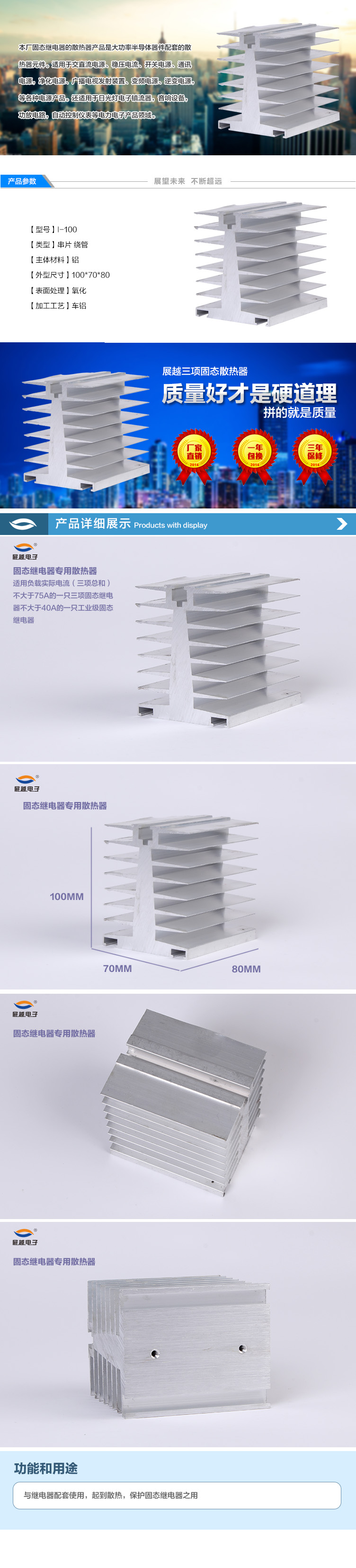 选用散热器除考虑上述因素外,还要考虑固态继电器或模块本身体积与散热器能否相配,以及散热器在机柜中的安装空间。但最终要保证使在最恶劣情况下固态继电器或模块的底板温度不得超过80℃.